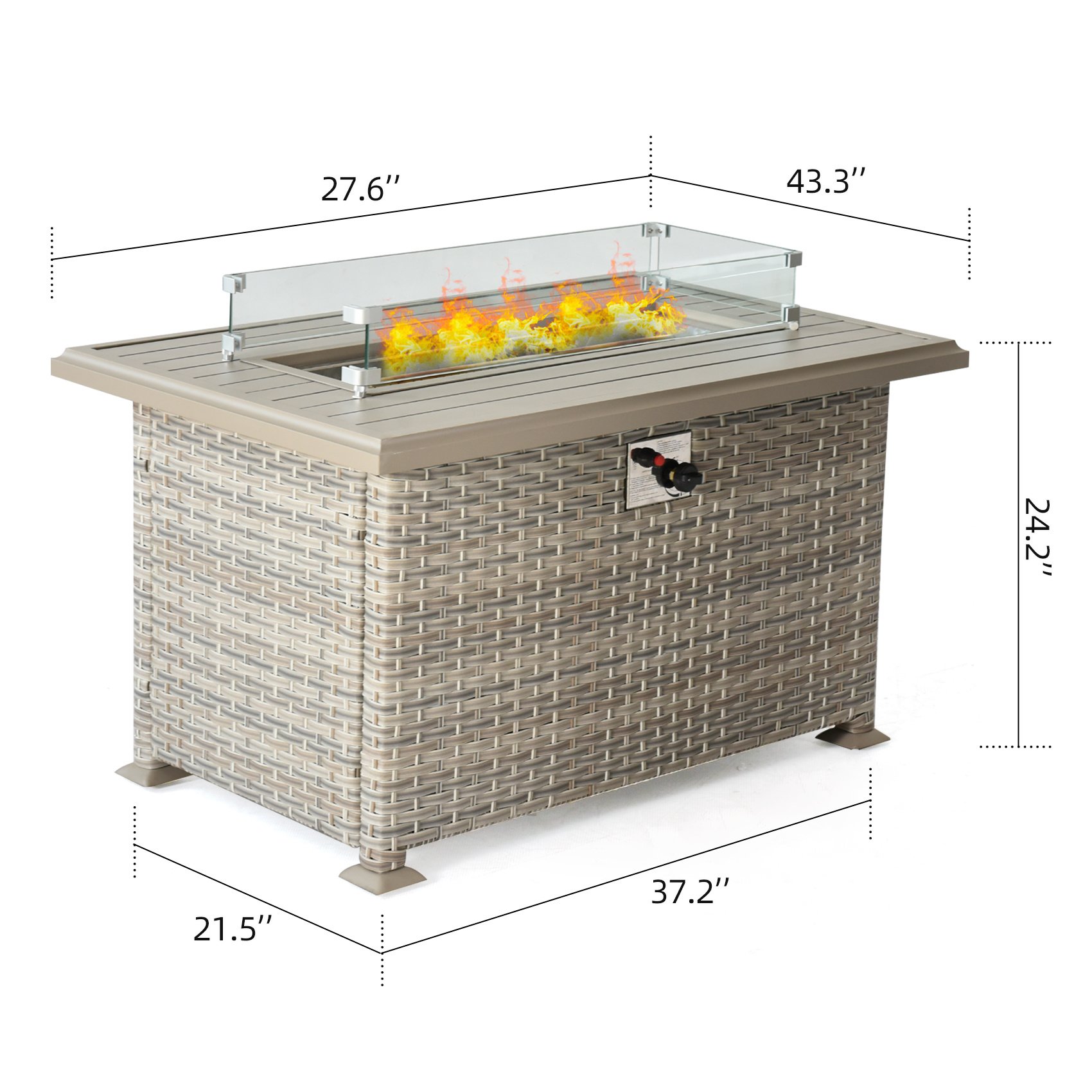 Great countertop space27'6 * 43'3 aluminum countertop is easy to clean. When flame is not used, you can cover it. Our fire pit table can become a dining tableClever designthe pull-out design allows propane storage tanks to be placed very well, and the 4-inch high glass wind guard allows the flame to burn gracefully